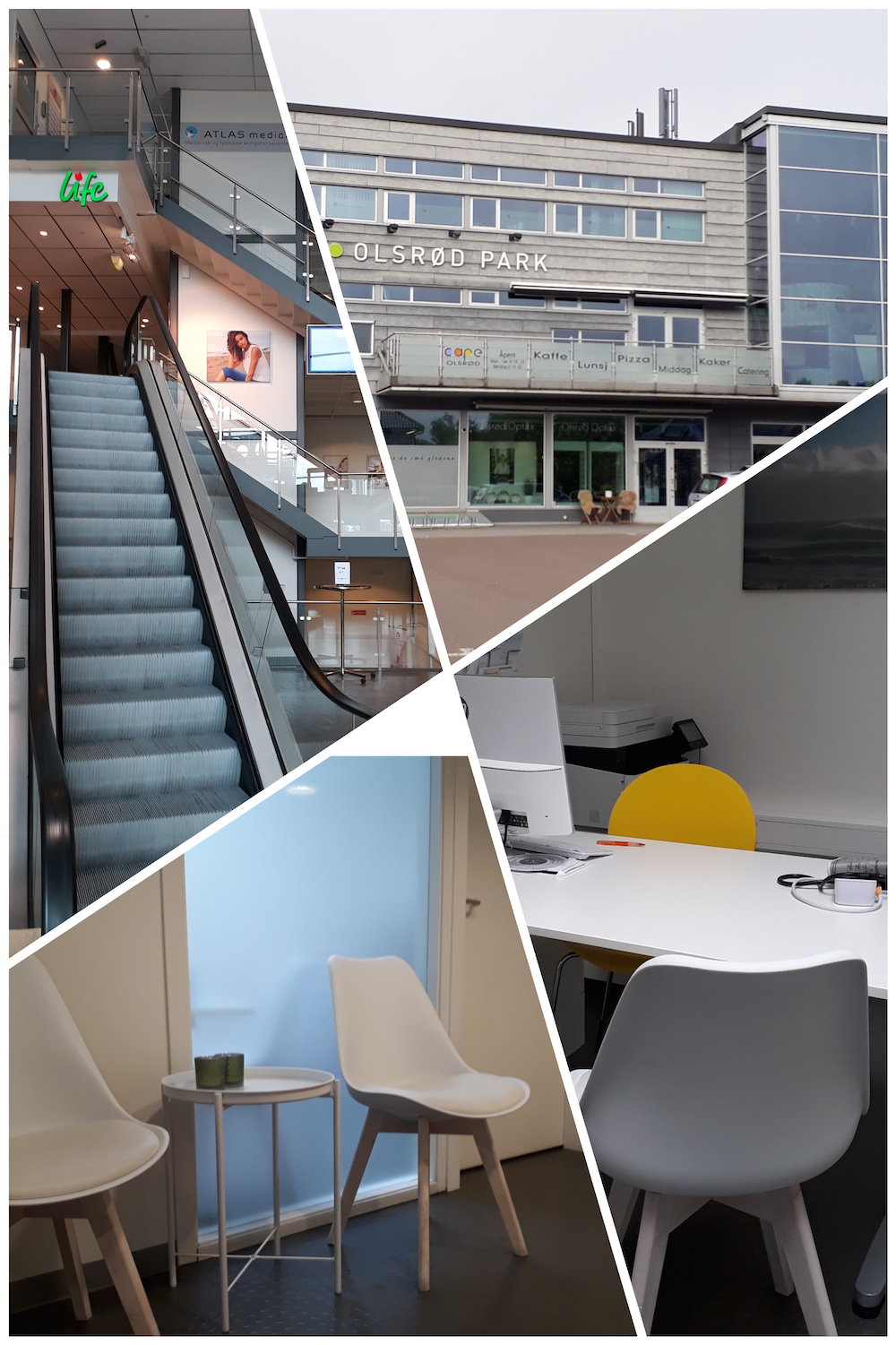 Vi holder til i 4.etasje, hos Atlas Medica. Ta rulletrappen eller heisen opp.